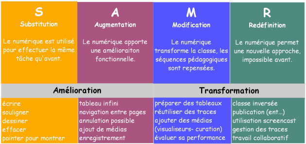 Le modèle SAMR est un modèle théorique proposé par Ruben Puentedura (enseignant à Harvard et spécialiste en éducation) qui décrit les différents paliers d'intégration des technologies dans une séance de classe selon plusieurs niveaux d'efficacité pédagogique.